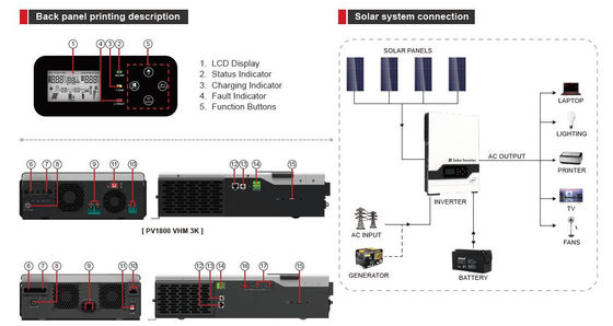 FT1800 VHM, portatif boyutta kesintisiz güç desteği sunmak için inverter, güneş şarj cihazı ve pil şarj cihazının işlevlerini birleştiren çok fonksiyonel bir inverter/şarj cihazıdır.Kapsamlı LCD ekranı, akü şarj akımı gibi kullanıcı tarafından yapılandırılabilir ve kolay erişilebilir düğme işlevini sunar., AC/güneş şarj cihazı önceliği ve farklı uygulamalara göre kabul edilebilir giriş voltajı.